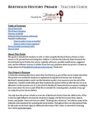 付属の教師用ガイドには、コロラド州の社会科第 2 学年基準、入門書のアドレス、利用可能なバージョン (およびその使用方法)、および可能な使用方法と変更点が記載されています。